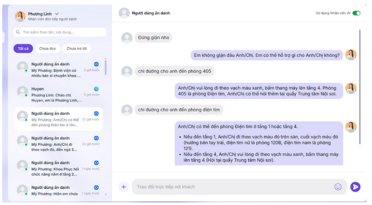 • Tại đây, bạn có thể theo dõi và quản lý các cuộc hội thoại giữa người hỏi và Nhân viên AI.